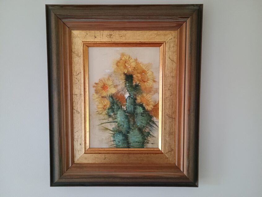Do you have paintings on the walls of your home? For many years, we didn’t, mainly because we lacked the spare money to afford such things. But, more recently, we have been able to acquire quite a few from house clearance auctions. I am particular about where to display these, such that after last redecorating our dining room, the walls remained mainly bare for a couple of years as I resisted the temptation to just put some things up for the sake of doing so. However, this has recently been remedied, and the new décor includes a particular work that is in direct eyeline when approaching the entry to the room from our kitchen. This picture is a rather indistinct original painting, an image of a flowering cactus. I appreciate that this subject, with its spikey leaves, must be quite challenging for an artist to portray clearly, but nevertheless, it takes a certain level of concentration to recognise what this particular image is meant to be. What makes this work worthy of display isn’t the art itself but the frame that it is mounted in.